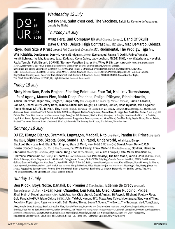 Dour Festival 2016 Le programme est clôturé ! Le Festival de Dour termine son affiche avec une énorme surprise : une 9ème scène se rajoute, consacrée aux nouveaux djs et producteurs de musiques électroniques. Détails Début : 13/07/2016 @ 12 h 00 min Fin : 18/07/2016 @ 4 h 00 min Catégorie d’Évènement: Festivals à venir Organisateur Official Dour Festival Site Web : http://www.facebook.com/dourfestival Lieu Dour Festival Dour, 7370 Belgium Évènements liés Nuits Sonores 2026 (Lyon) 13 mai @ 8 h 00 min - 17 mai @ 23 h 00 min