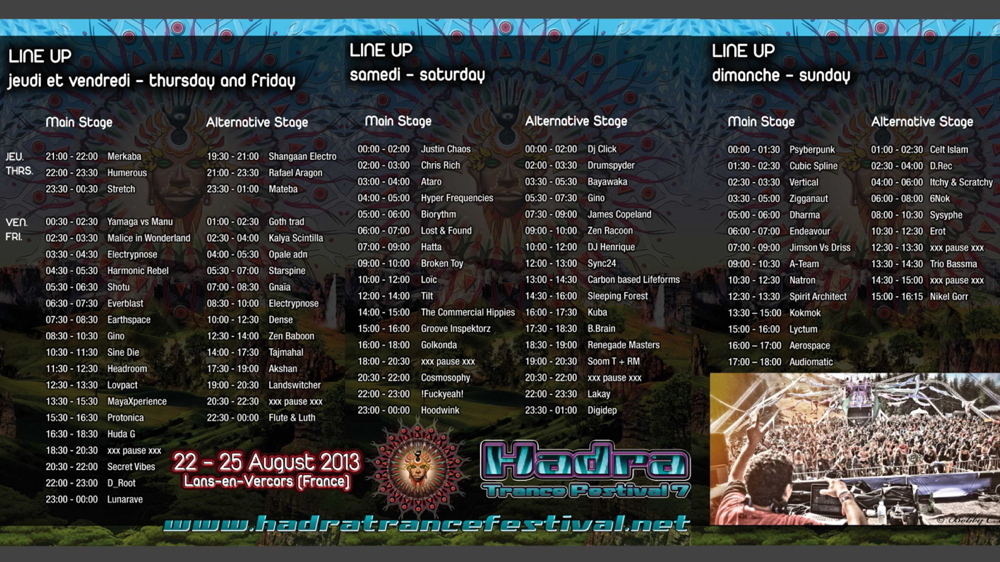 Hadra Trance Festival 2013 Un partenariat teckyo.com pour 4 jours inoubliables de Trance, mais pas que, grâce à l’Alternative Stage aux sonorités Ambient, World, Dub et Bass Music… http://www.hadratrancefestival.net Détails Début : 22/08/2013 @ 19 h 00 min Fin : 25/08/2013 @ 5 h 00 min Catégorie d’Évènement: Festivals à venir Organisateur Hadra Festival Site Web : http://www.hadra.net Lieu La Sierre La Sierre Lans-en-Vercors, 38250 France Évènements liés Nuits Sonores 2026 (Lyon) 13 mai @ 8 h 00 min - 17 mai @ 23 h 00 min