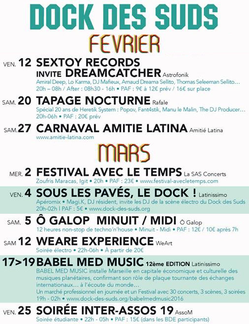 A noter qu’en plus de produire la Fiesta des Suds et Babel Med Music, notre association produit aussi chaque mois un événement « electro » : Sous les pavés les Dock ! où nous invitons un artiste ou un collectif à proposer une programmation de 20H00 à 02H00.